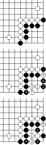 제1형 백선패 ![]() 문제도 흑의 이 ㄱ자 모양이 정통의 됫박형이다. 됫박형의 사활은 한수를 보강하든 안하든 대개는 빅이다. 백의 침입의 급소는 모양의 중심인 2-2 점이다. 정답 백1로 치중해오면 흑은 1-2에 붙이는 수가 정수. 백은 흑의 붙임이 있는 반대쪽에서 젖히는게 또한 정수. 흑4로 늘어서는 수가 맥으로 흑은 패로 산다. 자살 흑5로 늘지않고 흑2로 바로 막으면 흑이 죽는다. 제2형 백선패 ![]() 문제도 흑이 1-2에 붙여왔을 때 백의 다른 응수법을 생각한다. 좁은 곳이니 만큼 그리 어려울 것은 없다. 정답 백1, 흑2를 교환한 후 백3으로 젖히는 수단이 있다. 이 모양에서도 흑4로는 얌전히 늘어둔다. 패 변화 백1로는 흑2로 붙인 반대쪽으로 느는 수도 있다. 흑2로 내려섰을 때 백3으로 젖혀 귀는 역시 패가 된다. 제3형 흑선패 ![]() 문제도 백이 2-2에 치중하지 않고 1선을 젖혀온 모양이다. 백의 행마가 다소 의아스럽겠지만 젖힘은 언제나 위력적이다. 흑이 정확히 응수하면 결과는 어찌될까? 정답 2-2의 치중이든 젖힘이든 흑은 1-2가 수비의 급소이다. 흑1에는 백2의 껴붙임이 급소로 이후 백10까지 정답은 패이다. 변화 백3의 껴붙임을 생략한채 백1로 바로 젖히는 수도 있다. 백2로 늘 때 백3으로 껴붙여도 역시 패가 된다. 실패 백의 젖힘에 흑1로 바로 막으면 흑이 죽는다. 흑1로 바로 막으면 백2로 반대쪽을 껴붙인 후 백4로 뛰어붙여 백6까지로 흑이 저항도 한번 제대로 못해보고 죽는다. 제4형 흑선활 ![]() 문제도 이번엔 백이 1-2의 급소를 차지한 모양이다. 적의 급소는 나의 급소라고는 하지만 1-2가 백의 급소일까? 흑의 최선의 응수을 찾아주기 바란다. 정답 뛰어든 백 한점이 넘지못하게 흑1로 내려서는 수는 절대. 백2로 껴붙였을 때 흑3의 치중이 연이은 흑의 호수. 이하 흑7까지 흑활이다. 증명 백8로 흑두점(흑3,흑5)를 따면 흑은 가만히 흑9로 단수한다. 흑11로 백한점을 따먹었을 때 백은 백두점을 잇지못한다. 이로써 흑활이다. 제5형 흑선패 ![]() 문제도 백이 가만히 껴붙여오면 됫박형(흑)의 사활은 어찌될까? 껴붙인 수가 2-2의 치중보다 못하다면 흑이 살 것이다. 껴붙인 수가 2-2와 비슷하다면 패가 될 것이고... 흑의 최선의 수순을 찾아라. 정답 백의 껴붙임에는 흑도 2-2로 껴붙이는 수가 호수. 백2의 젖힘에는 흑3으로 받고 흑5까지로 역시 패가 된다. 껴붙이는 수 역시 2-2와 비슷한 급소라고 하겠다. 실패 백의 껴붙임에 흑1로 1-2에 받는 수는 뭔가 느슨하다. 백8까지 오궁도화로 흑이 죽는다. 제6형 백선패 ![]() 문제도 흑이 1선젖힘을 가지고 있으나 대신 바깥공배가 하나도 없다. 공배가 없는 마큼 흑이 살기가 매우 힘들다 하겠다. 제1수로 흑의 생사가 결정된다. 정답 됫박형에서는 젖힘이 있든 없든 백1의 치중이 급소. 백1의 치중에는 강한쪽 1-2에 붙이는 수가 수비의 급소. 백3의 젖힘에 흑4로 늘어서 패. 변화1 백1의 치중에 흑이 약한쪽 1-2에 붙이는 수도 있다. 백2에는 흑3으로 가만히 늘어서 흑7로 패. 변화2 백1의 치중에 흑1로 부딪히는 수도 있다. 백7까지 귀는 패가 된다. 제7형 백선흑사 ![]() 문제도 흑의 됫박형에 바깥공배가 하나 있다. 바깥공배가 있으면 됫박형의 사활은 어찌되는가? 수싸움이나 사활은 언제나 공배의 갯수가 최종 결정을 한다. 공배의 중요성을 생각하면서 수를 읽어주기 바란다. 정답 공배가 있든 없든 됫박형에서는 백1의 치중이 급소. 백1의 치중에는 1-2로 붙이는 수가 수비의 급소. 1-2에 붙이면 백3은 반대쪽에서 젖힌다. 흑6으로 패. 실패 흑의 됫박형에 바깥공배가 비어 있는데도 백5로 내려서서 유가무가로 싸우겠다는 생각은 무리. 흑8까지 흑이 수상전을 이긴다. 정답2 위의 백5로는 내려뻗지 말고 1선을 젖히는 수가 정수. 흑2에는 백3으로 옹크려 귀는 패가 된다. 제8형 백선만년패 ![]() 문제도 바깥공배도 비어있고 1선젖힘도 있으면 사활은 어찌되나? 공배가 하나 있는 만큼 흑은 살기가 편?질 것이다. 백이 최대한 흑을 괴롭히기 바란다. 정답 공배가 있든 젖힘이 있든 백1의 치중이 급소가 된다. 백의 치중에 흑은 1-2에 붙이는 수가 수비의 맥. 백9로 1-1에 먹여치면 만년패가 된다. 변화 백의 치중에 흑은 강한쪽 1-2에 붙이는 것이 일반적이나 이 모양에서 강한쪽에 붙이면 사활은 패가 된다. 흑으로선 만년패가 더 편할 것이다. 제9형 백선만년패 ![]() 문제도 됫박형에서 양젖힘이 있으면 사활은 어떻게 되나? 양젖힘이 한쪽 젖힘보다는 유리할 것이나 대신 공배가 없다. 됫박형에서 젖힘이 유리한가 공배가 유리한가를 음미하자. 흑백간의 최선의 공방을 기대한다. 정답 백1에 흑2로 붙여오면 백3으로는 붙임의 반대쪽으로 는다. 백5로 먹여친 후 백7으로 잔뜩 옹크리고 버틴다. 흑8로 1-1에 뻗으면 빅, 손빼면 만년패가 된다. 만년패냐 빅이냐는 흑의 권리이다. 변화 백1에 흑2로 부딪히면 백5로 먹여쳐 귀는 패가 된다. 흑2 실착. 흑은 위처럼 두어야 한다. 제10형 백선흑활 ![]() 문제도 흑이 양쪽1선을 모두 내려선 실전에서는 보기드문 됫박형이나 됫박형의 특성을 이해하는데는 더 없이 좋은 모양이다. 됫박형은 젖힘이 있든 없든 내려섬이 있든 없든 거의 한결같이 패의 형태를 띈다. 그러나 양쪽